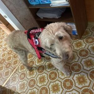 This is my curly-haired service dog. I trained him myself, and I’m so proud of that. Now he’s my best helper