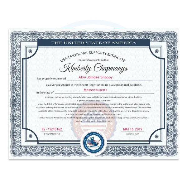 An ESA Certificate gives some privileges to your certified emotional support animal. These rights mainly comprise housing accommodations under the Fair Housing Act, which makes landlords provide reasonable accommodations for the assistance animals, including the emotional support animals. It also means you can take your certified emotional support animal with you to live at places where the owner has a ‘no pets allowed’ clause and without having to pay extra fees for the pet or deposits.