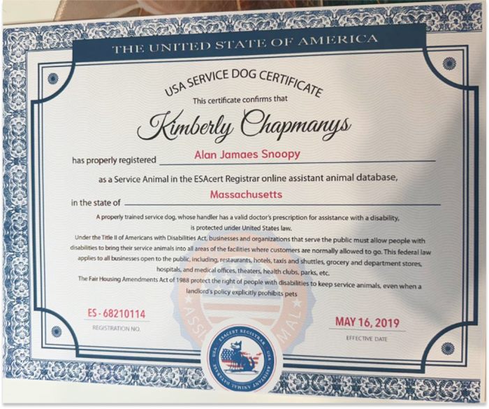You will receive a color-printed certificate in letter size, not laminated. It will include your personal information provided for your assistant animal registration, specifically: