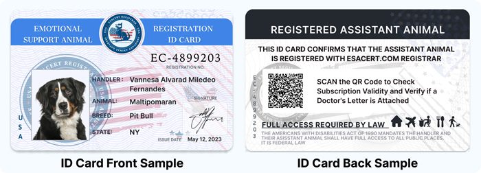 physical plastic ID card with all your information and a QR code for easy registration ESA animal status verification offline.
