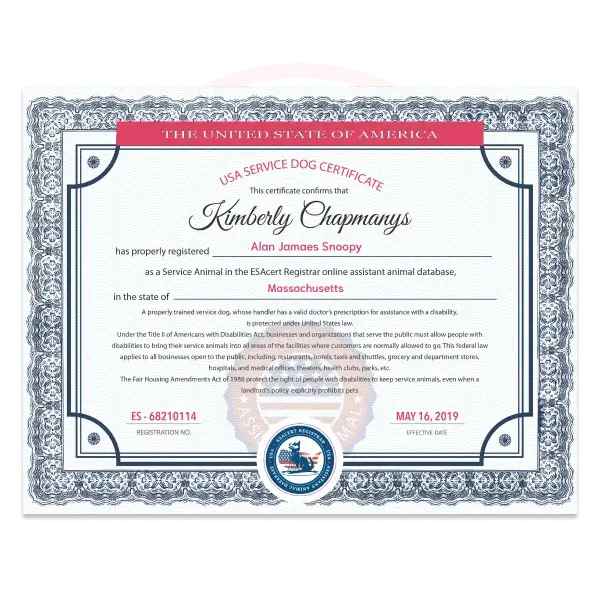 The certificate will also indicate the registration number and service dog laws and state that Esacert is the registrar. Service dog ID cards, tags, or vests are other forms of ID that demonstrate people accept your dog as a service animal.